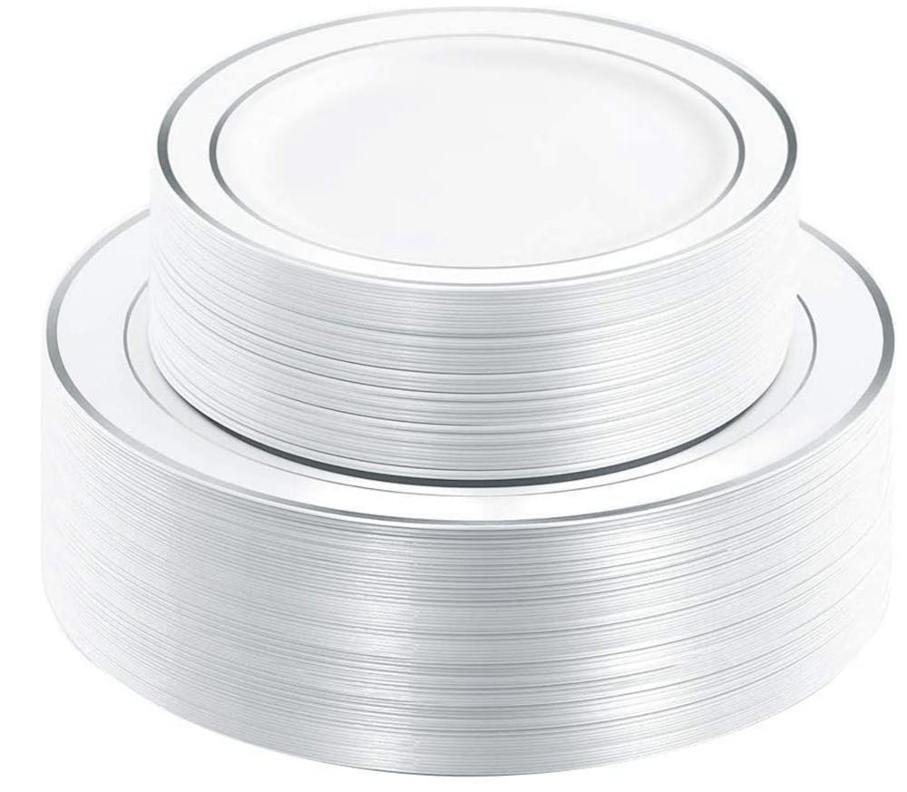 Standard Buffet Service with White (Round or Square) Disposable Plates and Disposable Silverware (gold or silver) with vanity napkins.